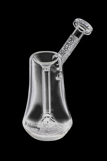Street art meets smoking culture in this K. Haring glass bubbler. This absolutely gorgeous bell-shaped bubbler features a hand-applied, artistic design on the neck and base that showcases the amazing work of acclaimed artist Keith Haring.