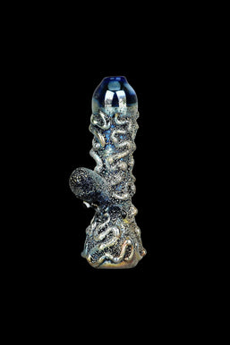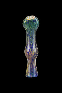 A close-up, angled view of the Fritted Fumed Taster Glass Chillum, showcasing its smoky, textured glass finish.