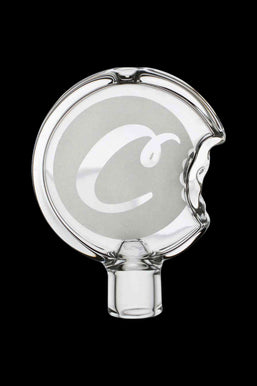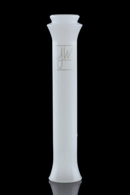 Frosted glass bubbler with engraved logo, reflecting on a black surface.