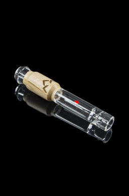 Clear glass smoking pipe with a wooden mouthpiece, reflecting on a black surface.