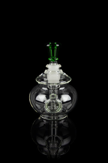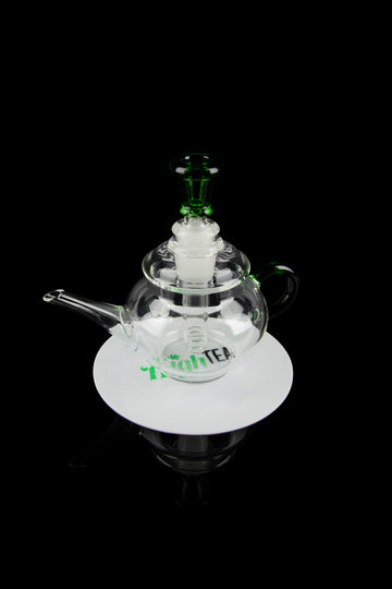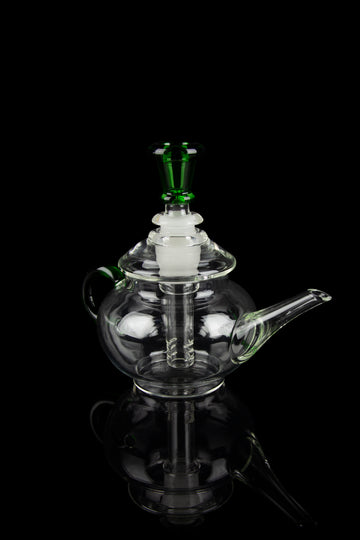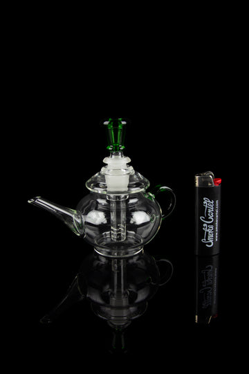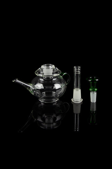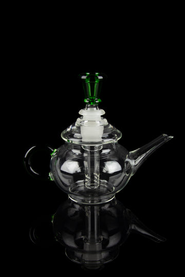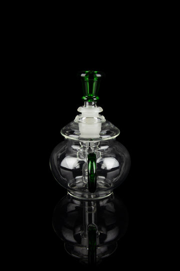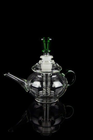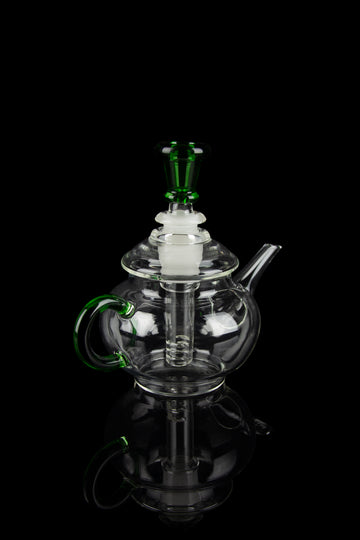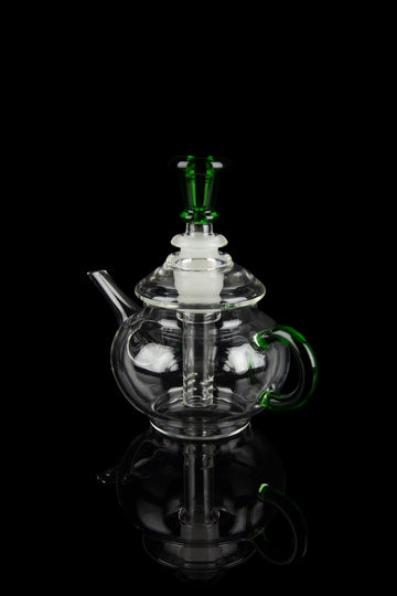 The bubbler is equipped with a 14.5mm female joint and comes with a 2-inch long removable diffused downstem and a 14.5mm male herb bowl. The bowl and the handle of the teapot are green which looks nice next to the clear glass.