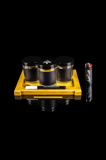 The inside of the Bzz Box designed with class, to satisfy even the most discerning cannabis connoisseur. There's a partition inside the cover that's made for rolling papers and cones as well as a fitted rolling tray made of bamboo. There’s even a perfectly placed hole in the corner of the tray you can use to easily sweep your excess ground herbs into the jar that’s located directly below it.