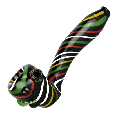This cool glass pipe features a spoon design with a large bowl which allows truly generous loads. The bowl is adorned with glass marbles and Rasta-colored swirls which run through the entire pipe. The colorful stripes really stand out on the black background.