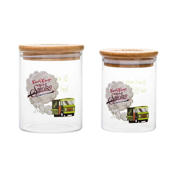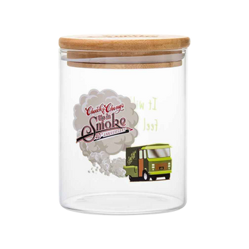 It features the movie quote on the back and the iconic green van on the front, all printed on a thick borosilicate glass jar. The lid is made with wood and has silicone lining for an airtight seal that keeps your herbs fresh for a long time.