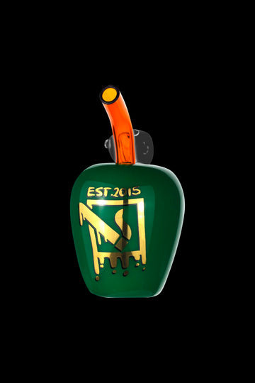 The Poisonous Apple Bong by Daily High Club is a 5-inch tall bong made of high-quality glass. It’s designed like a green apple complete with a curved orange colored stem that serves as a mouthpiece. It’s embellished with an awesome skull design decal in gold to give it a dangerous edge.