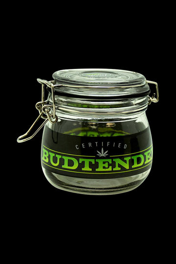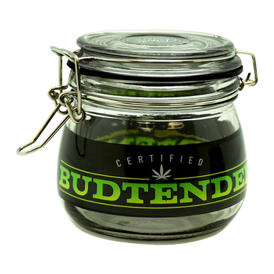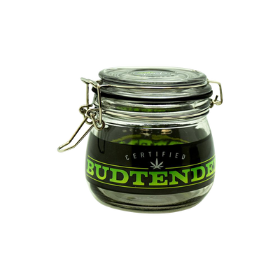 Made of quality borosilicate glass, this stash jar features a metal-hinged lid with a colored silicone seal that keeps air out and odors inside the jar. This great looking green glass stash jar features an exterior decal stating "Budtender'.