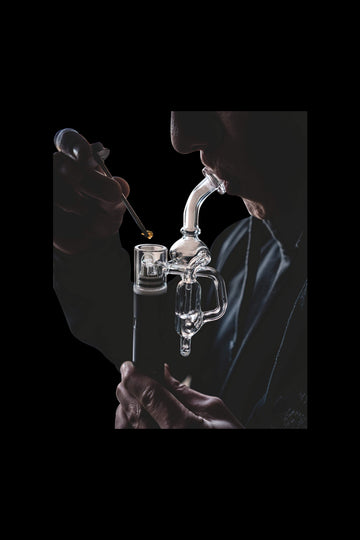 The Hyperloop Glass Adapter is a recycler-style bubbler attachment for the Elite Pro vaporizer rig from DabTech. The lower pill-shaped chamber percolates water and filters smoke, creating a smooth, enjoyable smoking experience. The Hyperloop attaches and functions the same as the original Elite Pro glass attachment, an all-in-one banger, bubbler, and mouthpiece!