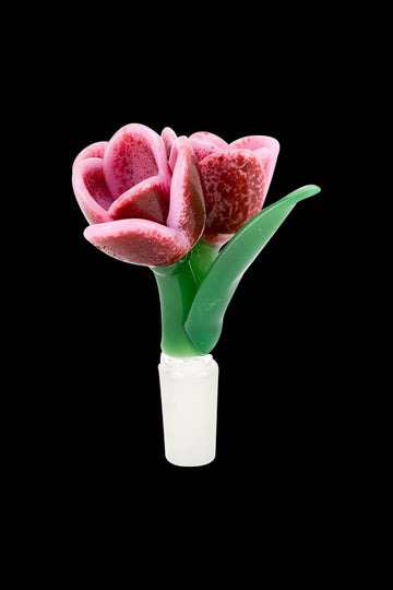 Dress up your 14.5mm female water pipe with this intricately designed 14.5mm male herb slide by Empire Glassworks. This beautiful dual-hole bowl piece features a double tulip design in pink and green.