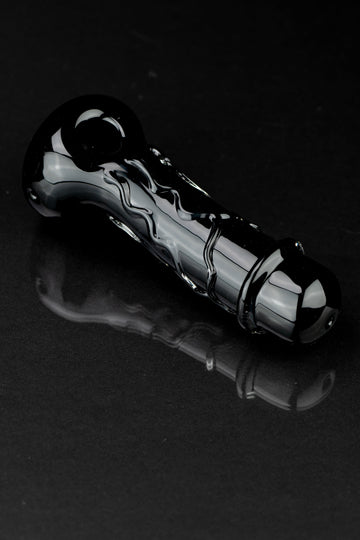 This penis spoon pipe features black borosilicate glass throughout the piece. Resembling a man's favorite tool, this hand-blown beauty is sure to impress or cause a laugh or two once you show it off to your friends.