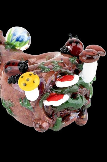 Now this is one heavily detailed and decorated spoon style pipe. Nature is Empire Glassworks’ answer to anyone searching for a unique and fantastic hand pipe. It’s covered in decorations like green moss, vines, mushrooms and small beings of the woods.