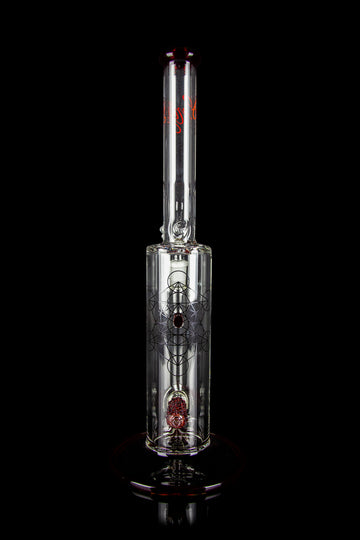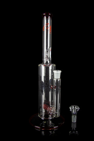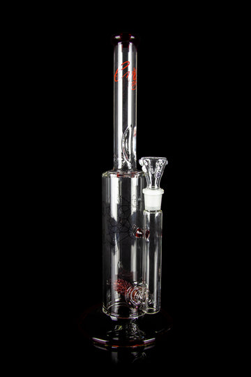 The perc practically crackles by itself as smoke and water filters through it, but the results are smooth as butter. Featuring pharmaceutical grade thick borosilicate glass Schott tubing, an 18mm female natural joint, an 18mm male herb slide/bowl, and matching accent colors, it's a piece that combines elegance with funk.
