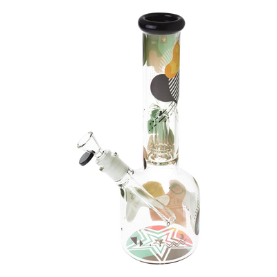 Aquarius is a real eye-catcher. It features a fun and colorful array of unique & quirky shapes and patterns on the water pipe with a matching colored star design on the bottom of the round beaker base. It has black glass accents on the bowl handle and mouthpiece rim to make this piece stand out.