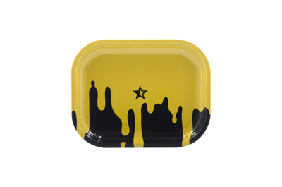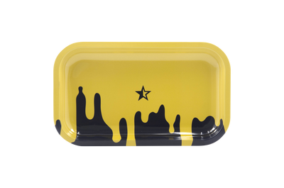 This metal rolling tray called 'Surrender' from Famous Design features an epic honey drip design on a black background. It's an eye-catching, durable rolling tray made of high-grade aluminum.