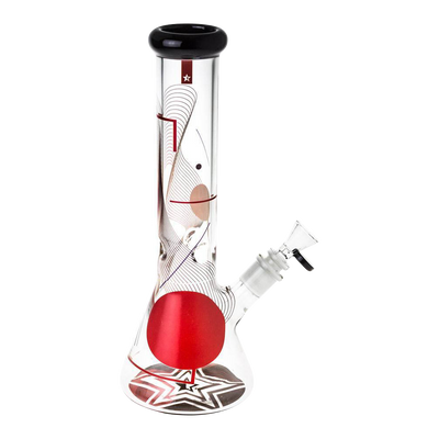 This stunning water pipe is printed with geometric shapes and lines in white and red. The bottom of the base ties the whole design together with its matching colored star illustration.