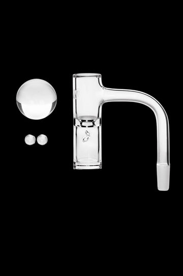 The GRAV® Hybrid Bucket Quartz Banger Set is a game-changer for those who value maximum efficiency and flavor in their dabs. This set includes the innovative Hybrid Bucket Quartz Banger, two 6mm quartz pearls, and a 20mm quartz marble. These additions enhance heat distribution and vaporization, ensuring a more satisfying dabbing experience. The cylindrical bucket with a central restriction and dual directional air intake creates a whirling tornado effect, keeping the pearls in motion for optimal vapor release.