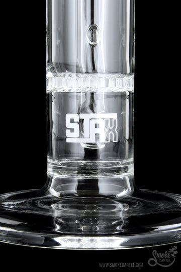 The STAX disc base is a standard flare base with a reinforced 90° joint and honeycomb disc. The disc perc diffuses smoke through a lot of small holes which adds drag but won't stop your flow completely. Included with purchase, is one 14.5mm flower bowl, one plastic keck clip, and one metal keck clip.