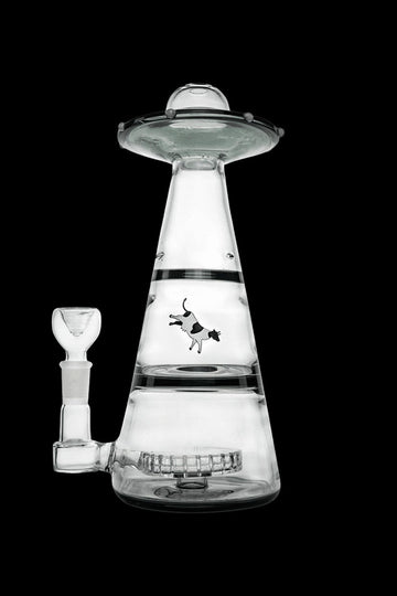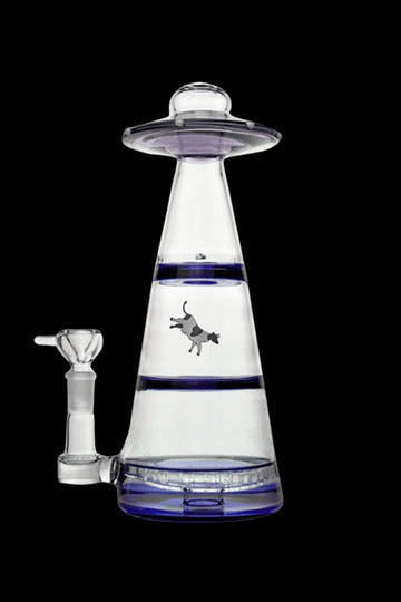 Here she is – behold the "Mothership"! This UFO bong is the larger edition of our UFO Vortex rig, made larger with an extra chamber for huge flower rips! We've added our inline percolator to push smoke bubbles up into a vortex chamber that spins and cools the smoke for a smoother hit. The added venturi inlets cause smoke to spin creating a cyclone effect that you can watch!