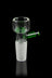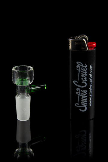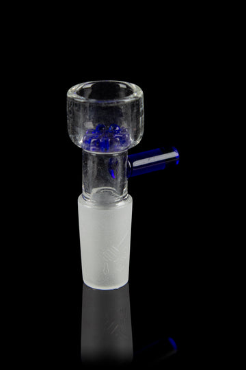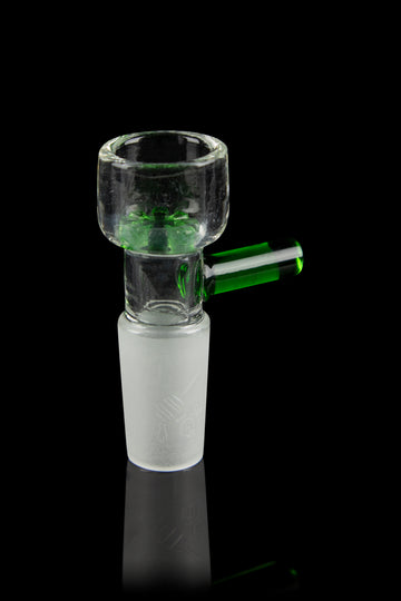 The bowl is outfitted with a frosted 14.5mm male joint, making it compatible with 14.5mm female-jointed bongs. There’s a handle on the side for easy lifting and to protect your fingers from the heat. The handle and built-in screen are colored for some added style in your choice of blue or green.
