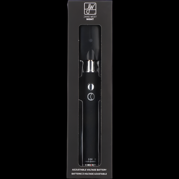 The stylish Jane West 510 threaded battery is compatible with most 510 thread cartridges and features a variable voltage dial, a power button in the center, and our signature moon icon to identify your Night cartridge of choice.