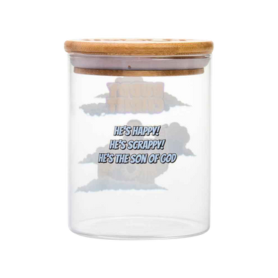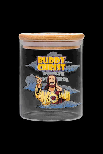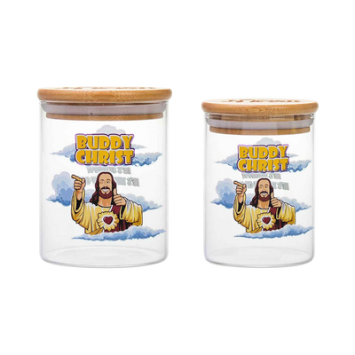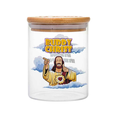 This jar is made with thick borosilicate glass, and is illustrated with Buddy Christ and a matching movie quote on the back. The wooden lid is reinforced with silicone on the bottom to provide an airtight seal and protect your herbs from drying.