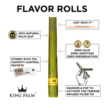 - Made from natural leaf rolls that are individually hand-picked and cleaned with purified water. No toxic fertilizers are used in the processing, chemical and preservative free. Each King Palm is individually hand rolled & tobacco free.