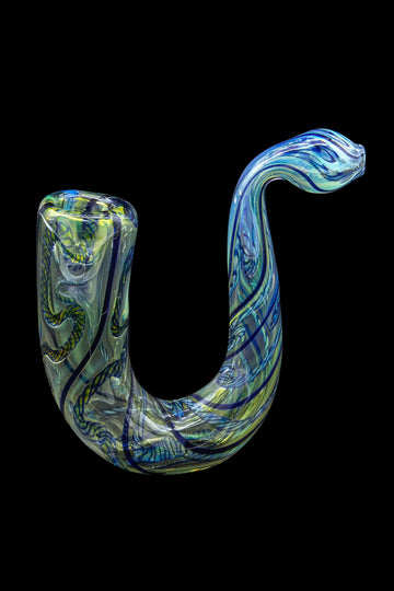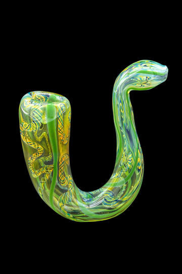 This sherlock-style hand pipe has been meticulously crafted by hand using high-quality borosilicate glass featuring an inside-out cane and latticinio design. The exterior of this pipe that’s made in sunny Los Angeles, California has been fumed with silver to make the it change color as you use it.