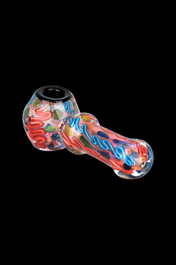Made of thick and durable fumed borosilicate glass, this spoon style handpipe is built to last. Its lustrous squiggles and dots design ain’t half bad either!