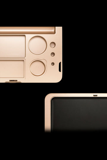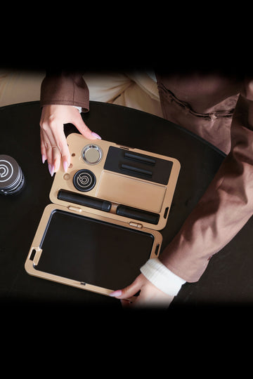 Introducing the ultimate in convenience and elegance, our MOBILE LAP TRAY is a must-have accessory for mobile consumption. Crafted from space grade premium aluminum, this tray features a smooth, easy-to-clean surface that is perfect for rolling with precision on the go. The raised edge ensures that your material stays in place, and the soft leather surface provides a comfortable external touch. Features a flat open design for maximum utility and provides all the storage and display functions of a desktop tray when opened, and the convenience of a portable survival kit when closed.