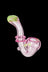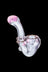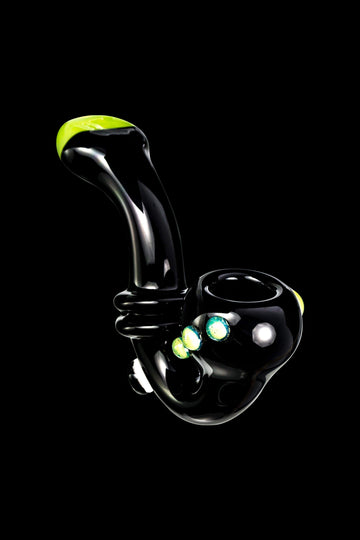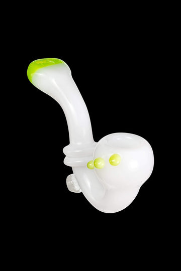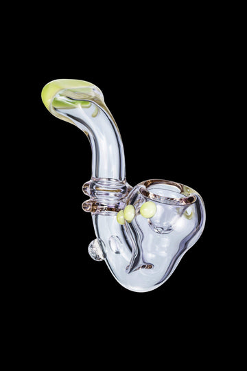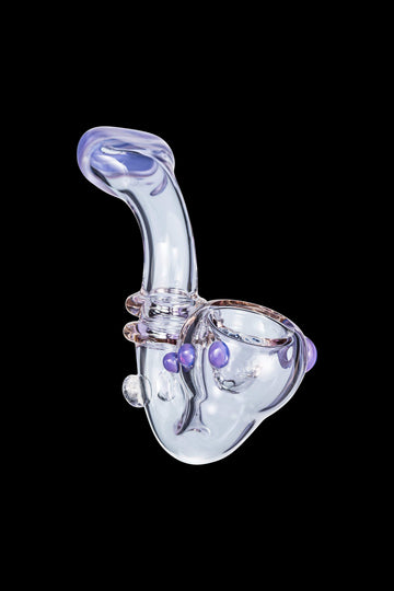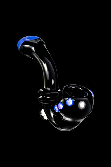 Following the bent neck you will see three raised glass marbles. These colorful bumps help with gripping the sherlock pipe when smoking out of it. On the opposite side of the marbles is a carb hole. This side carb hole allows you to control the airflow while inhaling. At the bottom of the bent neck there are two little glass feet. These feet allow you to rest your pipe on a flat surface without spilling your herbs.