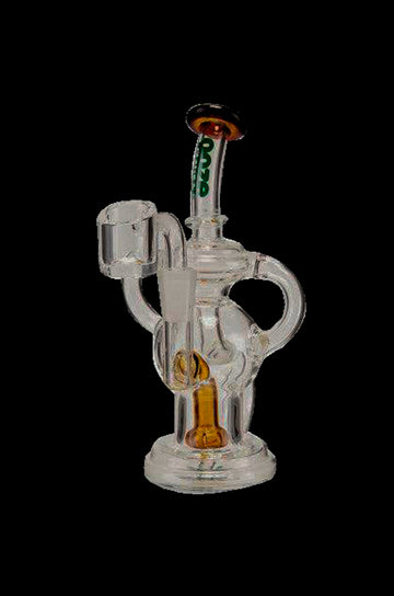 This clear glass mini rig looks sharp with the matching color on the downstem and mouthpiece and the Ooze logo on the neck.