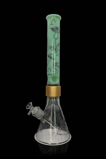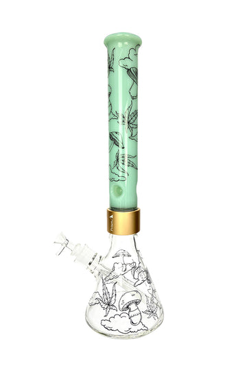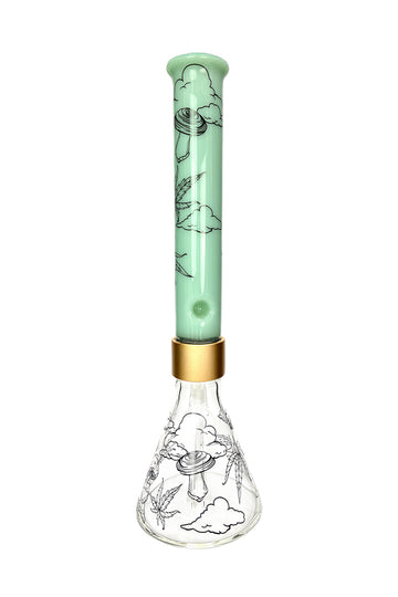 The Mint Sky High Bong is a gorgeous piece featuring mushrooms, clouds, and cannabis leaf decorations on the tall mouthpiece and the wide beaker base. The neck of the mouthpiece features a built-in ice catcher for those times you want to add a frosty edge to your rips.