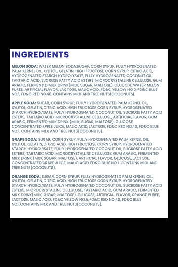 - Flavors: Grape, watermelon, apple, and orange.