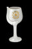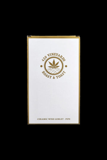 This unique pipe/wine glass combo is 9.25” tall and 5” wide and designed like a wine goblet. It’s made of white ceramic material and is embellished with a gold 420 Vineyards Roast & Toast decal that matches the gold rim around the top.