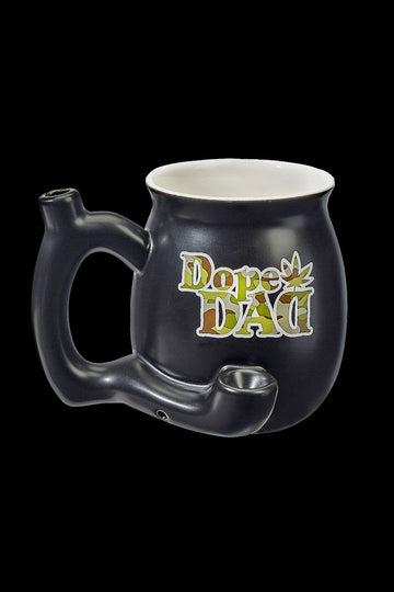 The black ceramic pipe mug is adorned with a Dope Dad decal on the front.