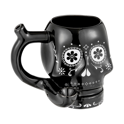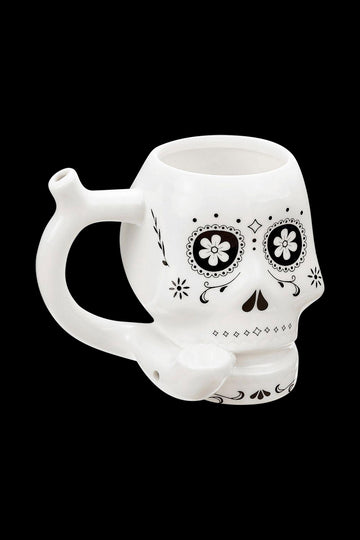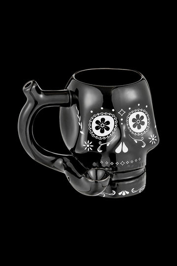 Perfect for wake and bake sessions, the Sugar Skull pipe mug comes in black and white.