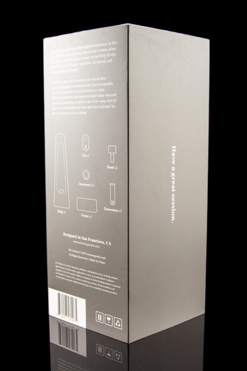 The angled mouthpiece and tapered form allow for a comfortable fit that's snug from top to bottom. It includes a silicone footer that protects the borosilicate glass base as well as indicating your water line for easy prep. It also features interchangeable silicone accessories so you can make it your own, as well as an extra grommet, bowl, and downstem-- just in case you get too excited.
