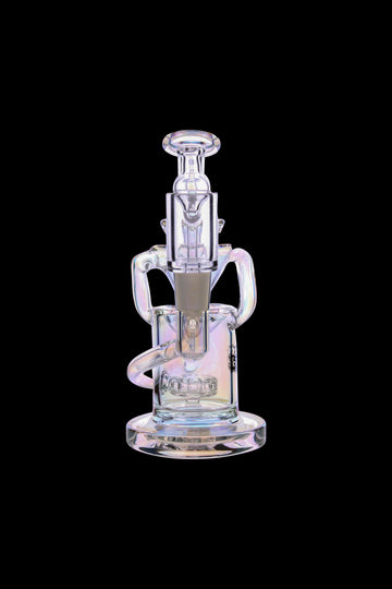 This stylish little dab rig that stands 5.5 inches tall is made of high-quality glass. It’s outfitted with a 10mm female joint and a fixed downstem. The showerhead percolator inside the smoke chamber works in unison with the recycling design to cool and smooth the vapor you inhale.
