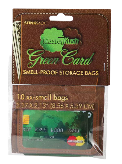 Want to discreetly and safely carry a bit of weed along with you? Use a MaterKush Mini Storage Bag by Stink Sack. This little bag with the credit card design is the same size as a credit card. When you put this little bag in your purse or wallet, nobody will know it’s not a real credit card. The plastic bag holds 1.75 grams of dry material which equals 1/16th of an ounce.