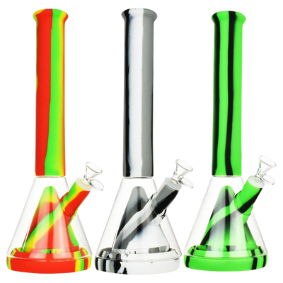 This beaker-style striped silicone & glass water pipe stands 14-inches tall. Perfect for parties, this colorful bong combines the durability of silicone with the ideal smoking qualities of glass.