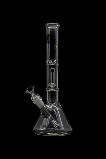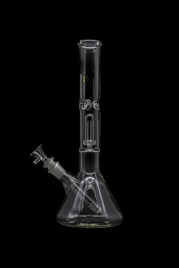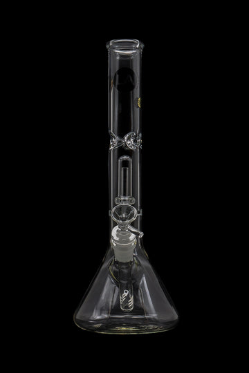 The 12" or 14" LA Pipes Single or Double Showerhead Perc Beaker Bong features 4.5mm thick durable clear boro glass, a removable 18-to-14mm diffuser down stem with recessed 18mm F ground joint, a single or double showerhead perc for extreme diffusion, tall straight neck mouthpiece and a wide flask base. Matching glass funnel herb slide w/ handle included. A permanent LA Pipes logo and emblem adorn the neck. 38mm diameter heavy wall.