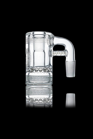 The Athos Ashcatcher is 3"H x 1.5"W x 2.5"L in size and fits 14.5mm 90-degree and 45-degree female joints. It's compatible with all VITAE bases (Beaker and Straights) and features a ratchet perc for adding smoothness to your rips.